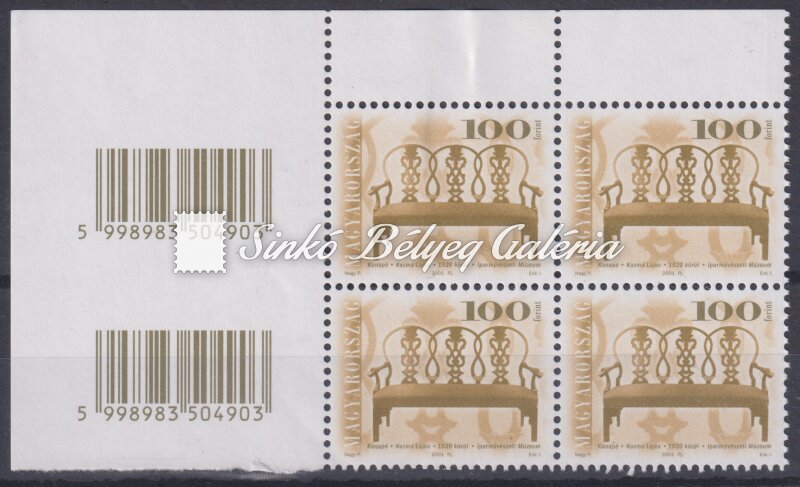 Description | 2001. Antik Bútorok (IV.) 100Ft bélyeg ívsarki vonalkódos 4-es tömbben Sihl SE papíron. / 2001. Antique Furnitures (IV.) 100Ft stamp in a block of 4 from the corner of the sheet, with barcode, on Sihl SE paper. |