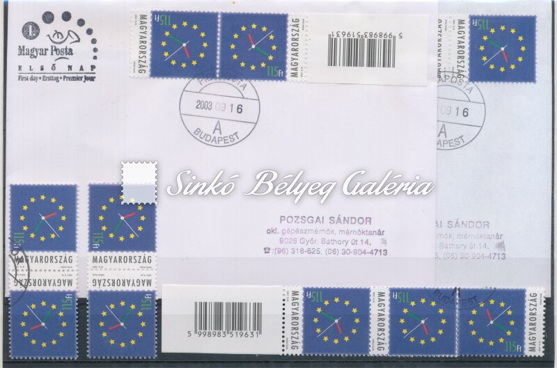 Leírás | 2003. Úton az Európai Unióba (I.) Bélyegpárok fordított és egyenes képállással, két szélén "Magyarország" felirattal. FDC-n is! Katalógus érték: 10.000 HUF / 2003. Way to the European Union (I.) Stamp pairs with reverse and straight picture positions, with "Hungary" subtitle on the sides! On FDC too! Catalogue value: 10.000 HUF |