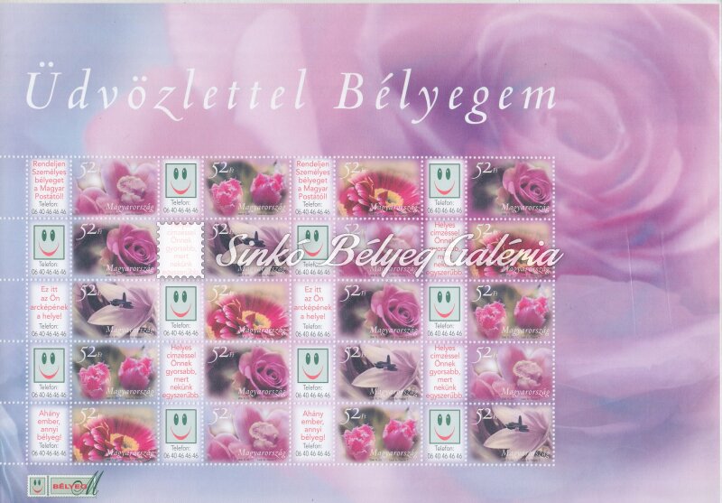 Leírás | 2006. Üdvözlettel bélyegem (II.) - Virágok Hajtatlan teljes ív. / 2006. My greetings stamp (II.) - Flowers Unfolded full sheet. |