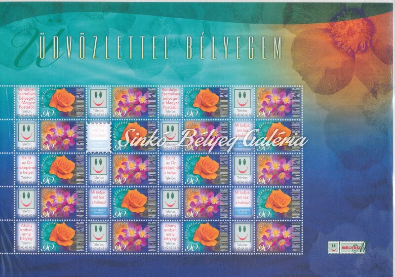 Leírás | 2006. Üdvözlettel bélyegem (III.) - Kék Hajtatlan teljes ív. / 2006. My greetings stamp (III.) - Blue Unfolded full sheet. |