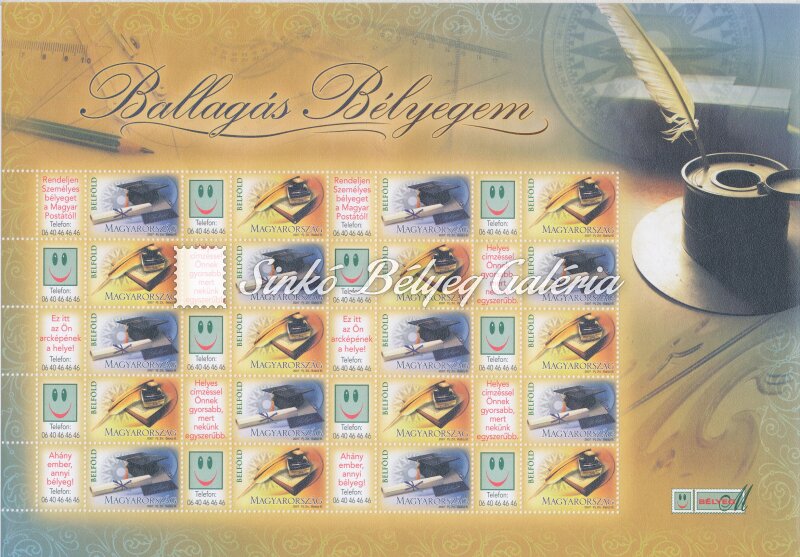 Leírás | 2007. Ballagás bélyegem (II.) - Tintatartó Hajtatlan teljes ív. / 2007. My graduation stamp (II.) - Ink stand Unfolded full sheet. |