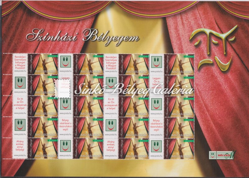 Leírás | 2011. Színházi bélyegem - értékjelzés nélküli hajtatlan teljes ív / 2011. My Theatre stamp - without denomination unfolded full sheet |