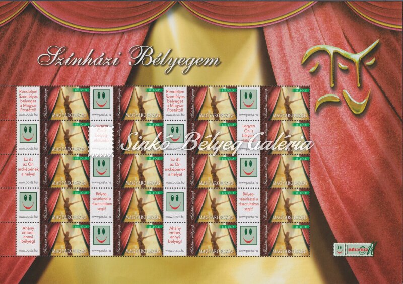 Leírás | 2011. Színházi bélyegem - értékjelzés nélküli ív. Katalógus érték: 7.500 HUF / 2011. My Theatre stamp - without denomination Unfolded full sheet. Catalogue value: 7.500 HUF |