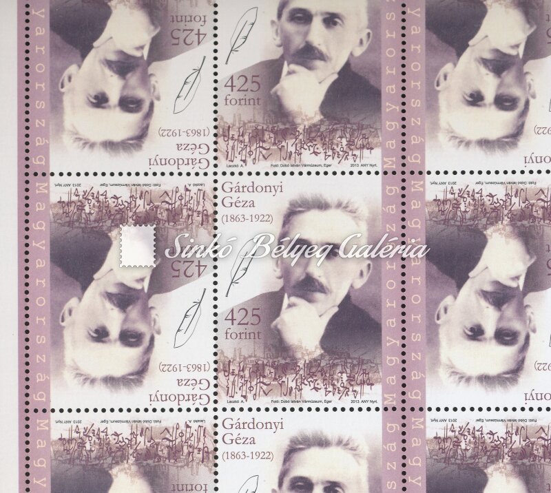 Leírás | 2013. Jeles Magyarok - 150 éve született Gárdonyi Géza. Hajtott teljes ív. (40 bélyeg) Hajtásnál sérült fogazat! / 2013. Prominent Hungarians - Géza Gárdonyi was born 150 years ago. Folded complete sheet. (40 stamps) Injured perforation by the fold! |