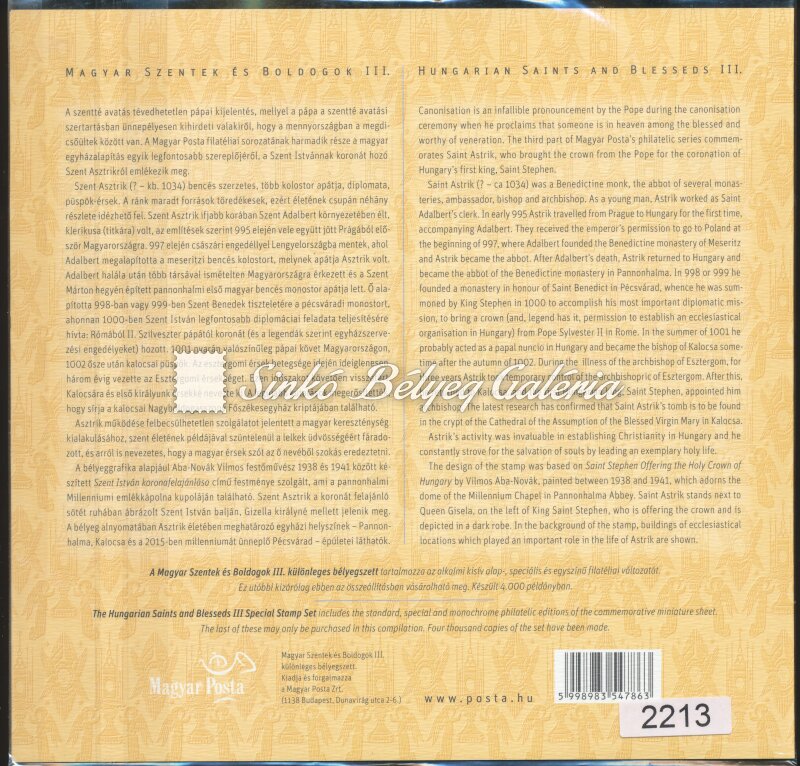 Leírás | 2015. Magyar Szentek és Boldogok (III.) - Szent Asztrik bélyegszett / 2015. Hungarian Saints and Blesseds (III.) - Saint Astrik stamp set |
