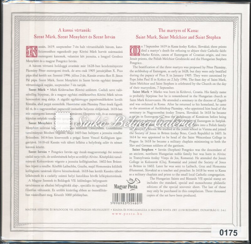 Leírás | 2019. Magyar Szentek és Boldogok (VII.) - Bélyegszett. Katalógus érték: 13.500 HUF / 2019. Hungarian Saints and Blesseds (VII.) - Stamp set. Catalogue value: 13.500 HUF |