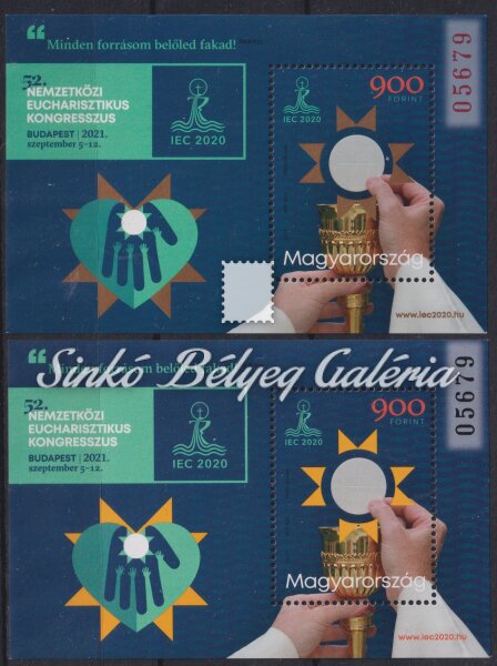 Leírás | 2021. 52. Nemzetközi Eucharisztikus Kongresszus - Blokk Ugyanaz a blokk, speciális változat arany színű festékkel díszítve, azonos sorszámmal! / 2021. 52th International Eucharistic Congress - Block Same block, special version decorated with gold paint, identical serial number! |