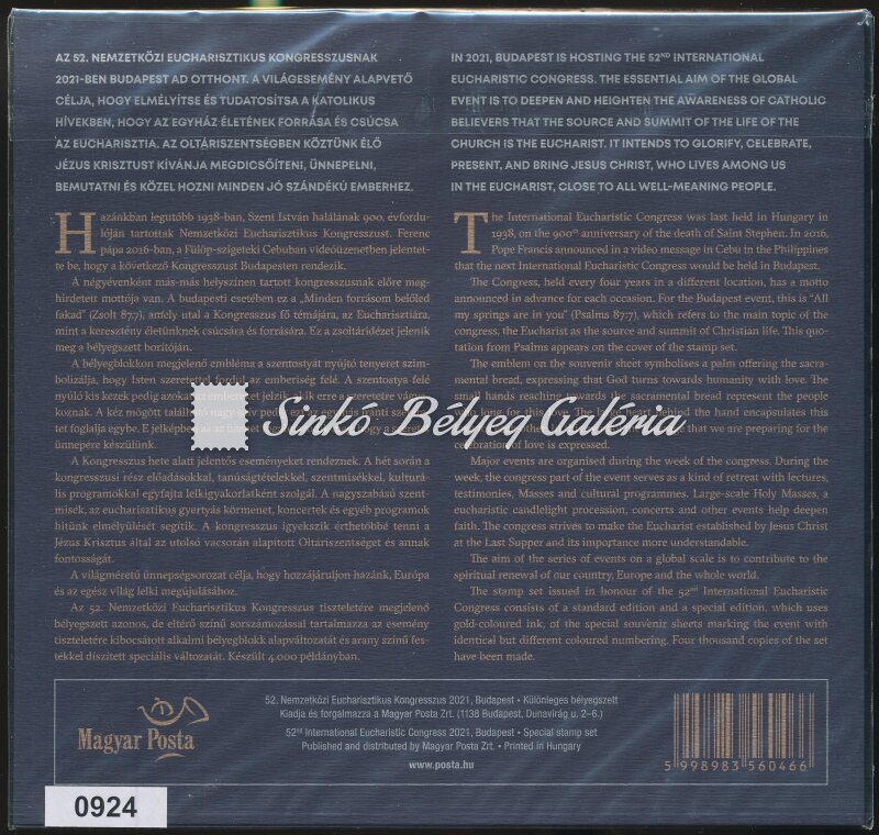 Leírás | 2021. 52. Nemzetközi Eucharisztikus Kongresszus - Különleges bélyegszett. / 2021. 52nd International Eucharistic Congress - Special stamp set. |