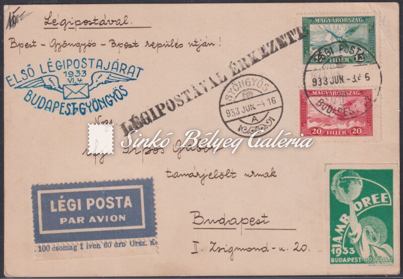 1933.06.08. Jamboree levélzáróval feladott légiposta levél BUDAPEST-GYÖNGYÖS