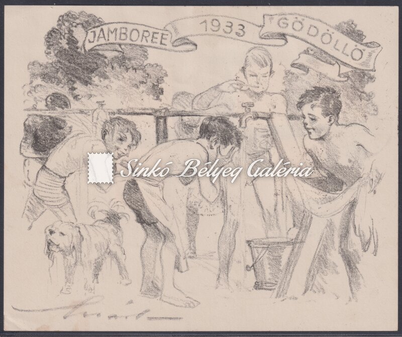 Leírás | 1933.08.15. Jamboree kézzel rajzolt cserkész jelenet aláírással! Hátoldali bélyegsor GÖDÖLLŐ bélyegzővel! / 1933.08.15. Jamboree hand-drawn scout scene with signature! Stamp set on the backside, with GODOLLO cancellation! |
