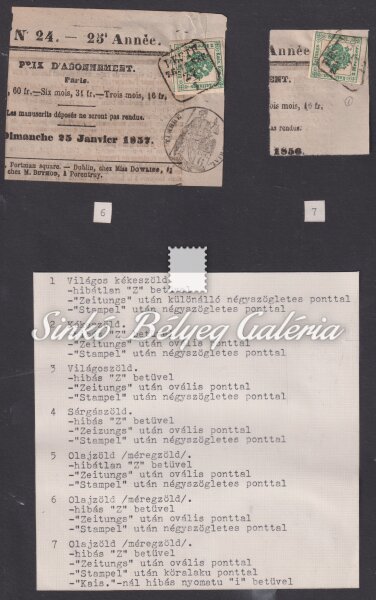 Leírás | 1853. Hírlapbélyeg tanulmány! 7db 2kr bélyeg PESTH lebélyegzéssel kivágáson! Különböző szinekben, lemezhibákkal! Kiállítási minőségben feldolgozva! R! / 1853. Newspaper stamp study! 7 pieces of 2kr stamps on pieces of letters with PESTH cancellation! In differenc colours, with plate failures! Processed in exhibition quality! R! |