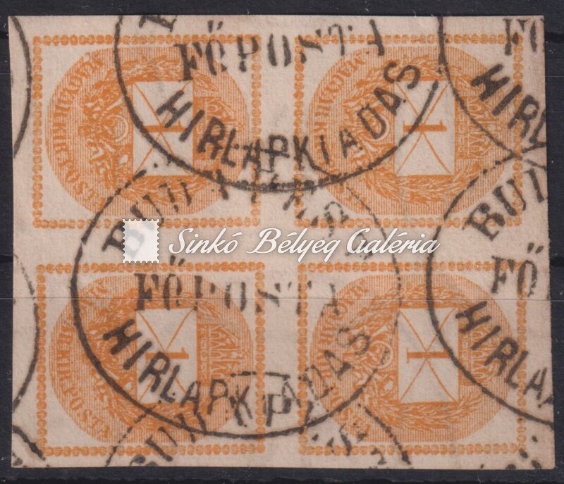 Leírás | 1881. Hírlapbélyeg 4-es tömbben, BUDAPEST FŐPOSTA HÍRLAPKIADÁS bélyegzővel! / 1881. Newspaper stamp in a block of 4 with BUDPAEST MAIN POST OFFICE NEWSPAPER PUBLISHING cancellation! |
