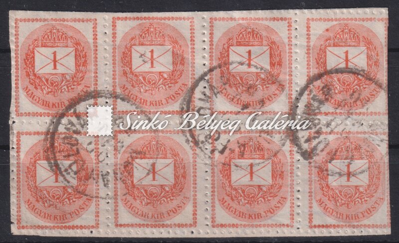 Leírás | 1898. Hírlapbélyeg 8-as tömbben 4-es vízjelállással! Magán fogazással, DUNAFÖLDVÁR lebélyegzéssel! / 1898. Newspaper stamp in a block of 8 with 4 watermark position! With private perforation and DUNAFOLDVAR cancellation! |