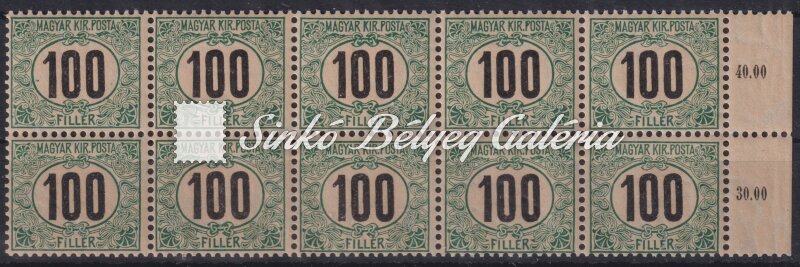 Leírás | 1903. Zöldportó (I.) 100f bélyeg ívszéli 10-es tömbben! Szép állapotban! / 1903. Green Porto (I.) 100f stamp in a block of 10 from the margin of the sheet! In nice condition! |