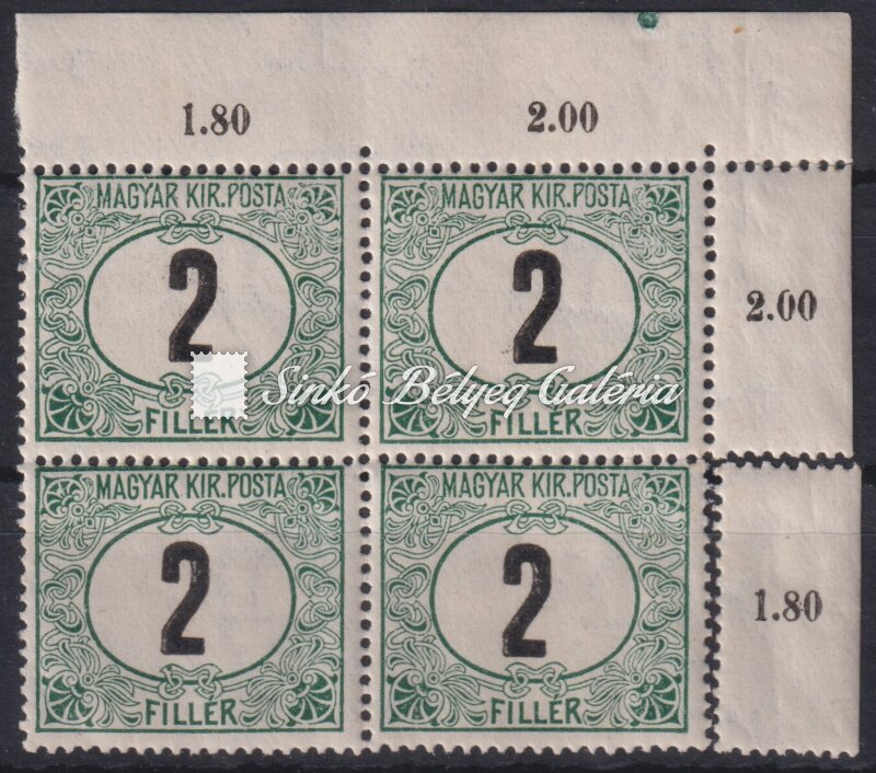 Leírás | 1908. Zöldportó (III.) 2f bélyeg ívsarki 4-es tömbben! Katalógus érték: 48.000 HUF / 1908. Green Porto (III.) 2f stamp in a block of 4 from the corner of the sheet! Catalogue value: 48.000 HUF |