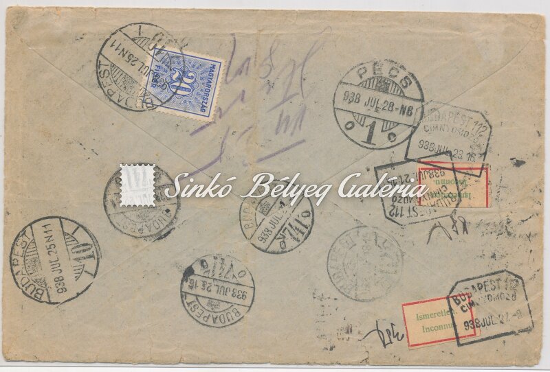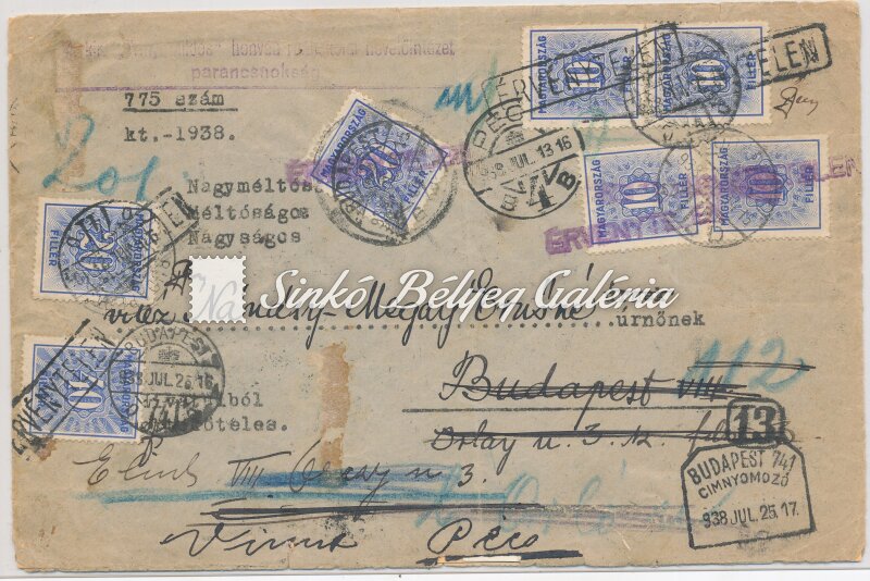 1938.07.13. Távolsági hivatalból portó köteles levél PÉCS-BUDAPEST