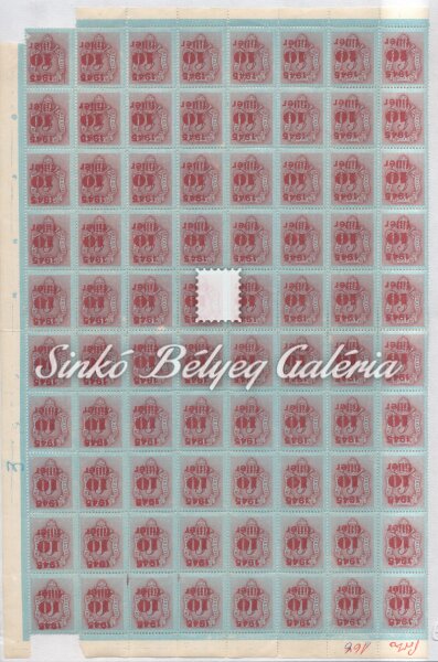 Leírás | 1945. Kisegítő Portó - tévnyomat 10f/3f bélyeg 80 darabos összefüggésben fordított felülnyomattal! Bepattant fogak! RR! Katalógus érték: 2.400.000 HUF + / 1945. Auxiliary Porto - misprint 10f/3f stamp in a sheet of 80 stamps with reverse overprint! Faulty, separating perforation! RR! Catalogue value: 2.400.000 HUF + |