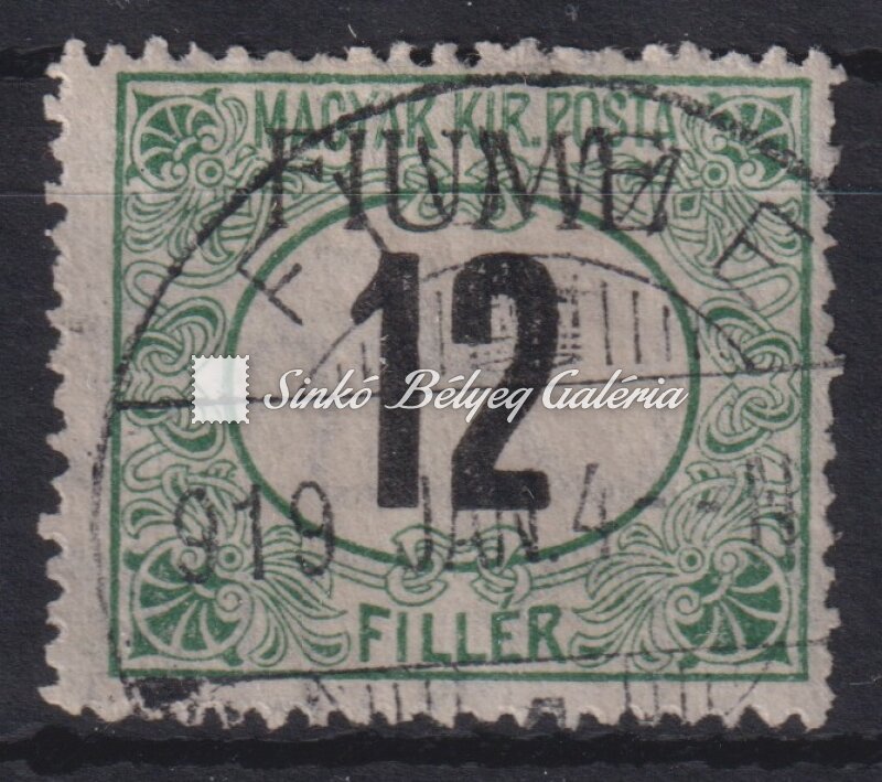 Leírás | 1918. Fiume (Olasz megszállás) 12f Feketeszámú Zöldportó bélyeg VII.a vízjellel, gépi II. felülnyomattal! Bodor M. bélyegszakértő hátoldali bevizsgáló jelével. / 1918. Fiume (Italian occupation) 12f Black number Green Porto stamp with VII.a watermark, and machine II. overprint! With the stamp expert, M. Bodor's proof sign on the backside. |