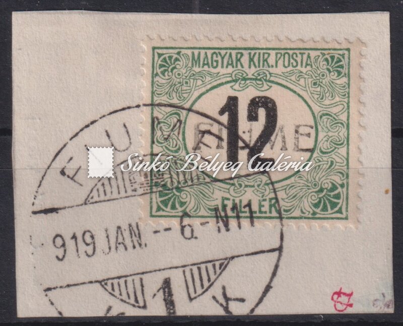 Leírás | 1918. Fiume (Olasz megszállás) 12f Portó bélyeg kivágáson, VII.a vízjellel, kézi IV. felülnyomattal! Bodor M. bélyegszakértő hátoldali bevizsgáló jelével. / 1918. Fiume (Italian occupation) 12f Porto stamp on a piece of a letter with VII.a watermark and manual IV. overprint! With the stamp expert, M. Bodor's proof sign on the backside. |