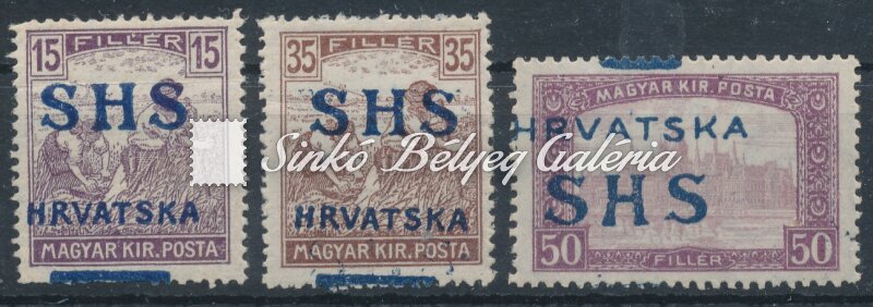 Leírás | 1918. SHS Horvátország 3db bélyeg jelentősen elcsúszott felülnyomattal! Bodor M. bélyegszakértő bevizsgáló jelével. / 1918. SHS Croatia 3 stamps with significantly slipped overprint! With the stamp expert M. Bodor's proof sign on the backside. |