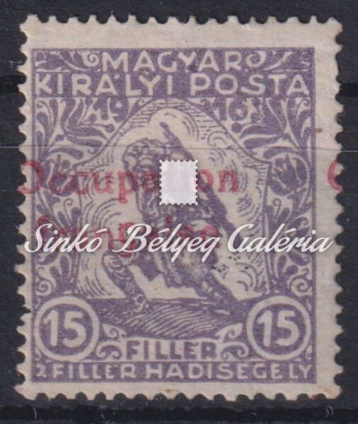 Description | 1919. Arad (Francia megszállás) 15f (2f) Hadisegély (III.) bélyeg eltolódott felülnyomattal! Bodor M. bélyegszakértő bevizsgáló jelével. / 1919. Arad (French occupation) 15f (2f) Military Aid (III.) stamp with slipped overprint! With the stamp expert M. Bodor's proof sign on the backside! |