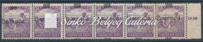 Leírás | 1919. Baranya (I.) (Szerb megszállás) 15f Arató bélyeg 6-os csíkban! Benne az antikva méretű számjegy! Bodor M. bélyegszakértő hátoldali bevizsgáló jelével. / 1919. Baranya (I.) (Serbian occupation) 15f Harvester stamp in a stripe of 6! Containing the antique sized number! With the stamp expert, M. Bodor's proof sign on the backside. |