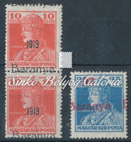 Leírás | 1919. Baranya (I.) (Szerb megszállás) Károly bélyegeken eltolódott felülnyomat. Bodor M. bélyegszakértő hátoldali bevizsgáló jelével. / 1919. Baranya (I.) (Serbian occupation) Shifted overprints on Karoly stamps. With the stamp expert, M. Bodor's proof sign on the backside. |