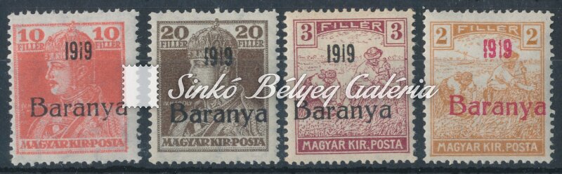 Leírás | 1919. Baranya (I.) (Szerb megszállás) 4db bélyegen az évszám második 1-es száma vékonyabb. Bodor M. bélyegszakértő hátoldali bevizsgáló jelével. / 1919. Baranya (I.) (Serbian occupation) On 4 stamps, the second number 1 of the year, is thinner. With the stamp expert, M. Bodor's proof sign on the backside. |