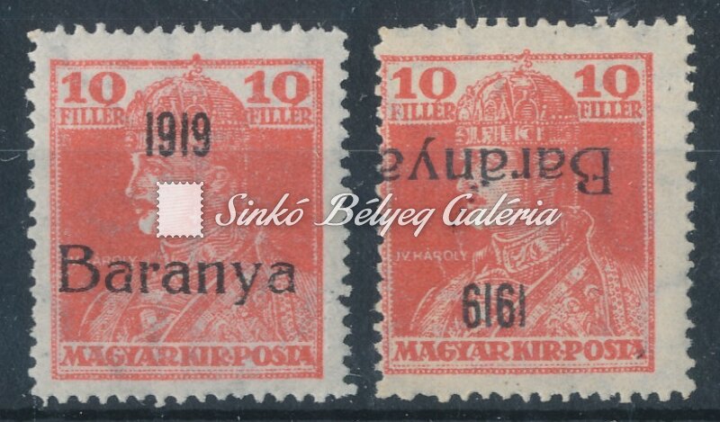 Leírás | 1919. Baranya (I.) (Szerb megszállás) 10f Károly bélyeg fordított felülnyomattal. Bodor M. bélyegszakértő hátoldali bevizsgáló jelével. / 1919. Baranya (I.) (Serbian occupation) 10f Karoly stamp with reverse overprint. With the stamp expert, M. Bodor's proof sign on the backside. |