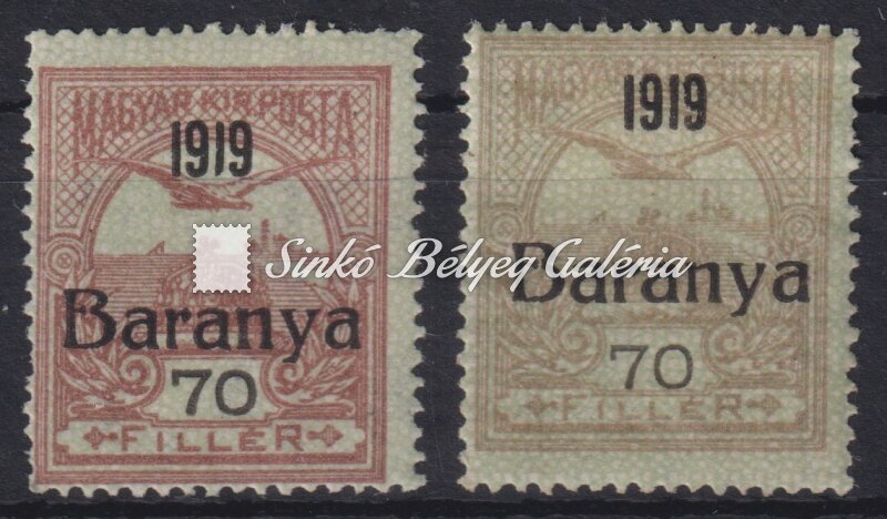 Description | 1919. Baranya (I.) (Szerb megszállás) 70f Turul bélyeg jelentős színeltéréssel! Bodor M. bélyegszakértő hátoldali bevizsgáló jelével! / 1919. Baranya (I.) (Serbian occupation) 70f Turul stamp with significant colour difference! With the stamp expert, M. Bodor's proof sign on the backside! |