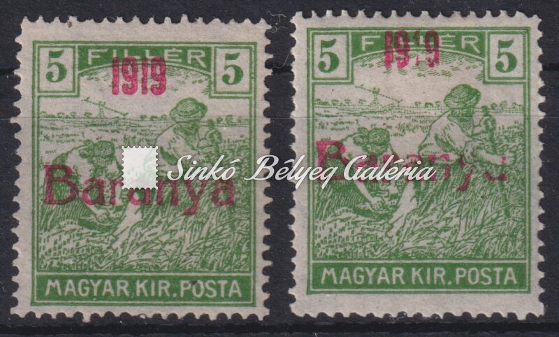 Leírás | 1919. Baranya (I.) (Szerb megszállás) 5f Arató bélyeg látványos felülnyomat hiánnyal! Bodor M. bélyegszakértő hátoldali bevizsgáló jelével! / 1919. Baranya (I.) (Serbian occupation) 5f Harvester stamp with spectacularly incomplete overprint! With the stamp expert, M. Bodor's proof sign on the backside! |