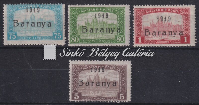 Leírás | 1919. Baranya (I.) (Szerb megszállás) 4db Parlament bélyeg antikva évszámmal! Bodor M. bélyegszakértő hátoldali bevizsgáló jelével! Katalógus érték: 16.800 HUF / 1919. Baranya (I.) (Serbian occupation) 4 Parliament stamps with antiqua year number! With the stamp expert, M. Bodor's proof sign on the backside! Catalogue value: 16.800 HUF |