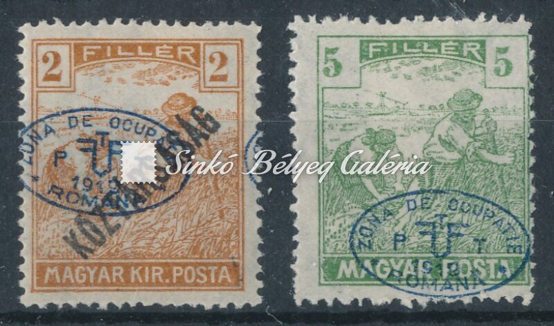 Leírás | 1919. Debrecen (I.) (Román megszállás) 2db bélyeg jelentősen elcsúszott felülnyomattal. Bodor M. bélyegszakértő hátoldali bevizsgáló jelével. / 1919. Debrecen (I.) (Romanian occupation) 2 stamps with significantly slipped overprint. With the stamp expert, M. Bodor's proof sign on the backside. |