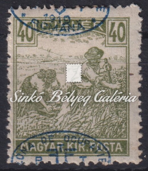 Leírás | 1919. Debrecen (I.) (Román megszállás) 40f Arató bélyegen jelentősen elcsúszott felülnyomat! Hátoldali bevizsgáló jellel. / 1919. Debrecen (I.) (Romanian occupation) 40f Harvester stamp with significantly slipped overprint! With proof sign on the backside. |