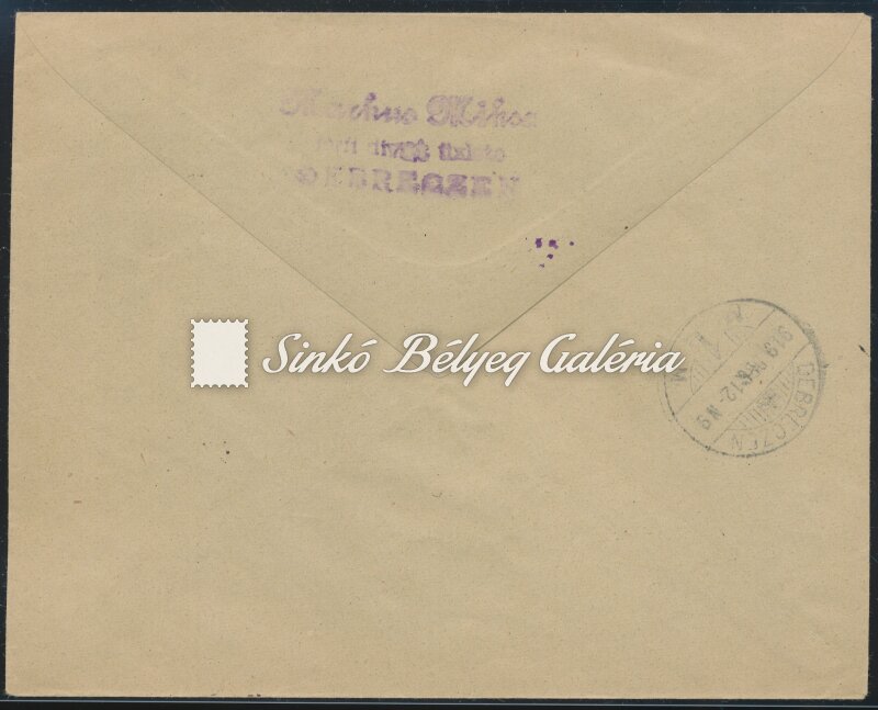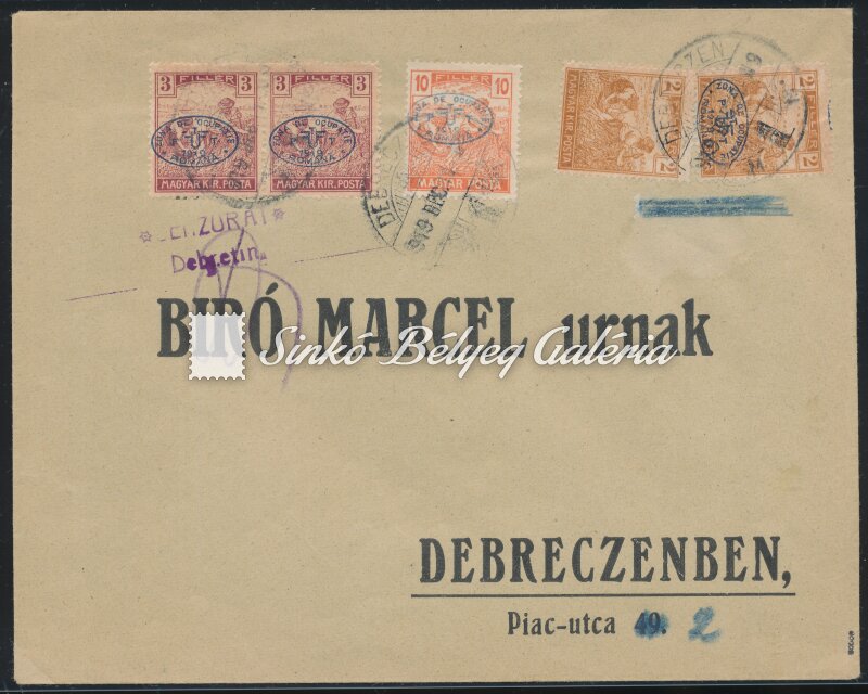 Leírás | 1919.12.11. Helyi megszállási levél DEBRECZENben. 2x3f + 2x2f Arató és 10f Magyar Posta bélyegekkel bérmentesítve. Az egyik 2f Arató bélyegről hiányzik a felülnyomat! R! Bodor M. bélyegszakértő bevizsgáló jelével. / 1919.12.11. Local occupation letter in DEBRECZEN. Franked with 2x3f + 2x2f Harvester and 10f Hungarian Post stamps. The overprint is missing from one of the 2f Harvester stamps! R! With the stamp expert, M. Bodor's proof sign. |