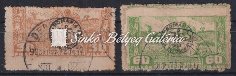 Leírás | 1920. Debrecen (II.) (Román megszállás) 2db bélyeg jelentősen elfogazva! Bodor M. bélyegszakértő hátoldali bevizsgáló jelével. / 1920. Debrecen (II.) (Romanian occupation) 2 stamps with significantly defective perforation! With the stamp expert, M. Bodor's proof sign on the backside. |