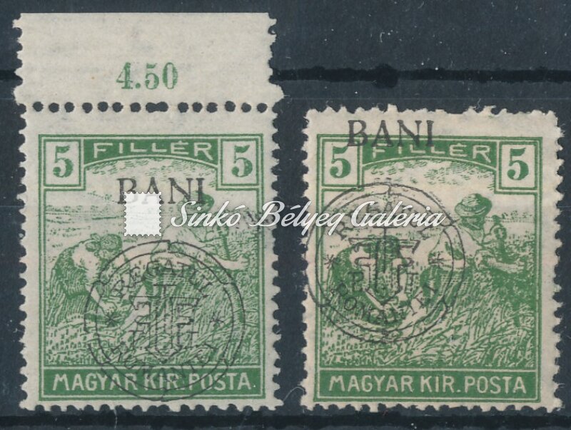 Leírás | 1919. Kolozsvári felülnyomás (Román megszállás) 5f Arató bélyegen eltolódott felülnyomás. Bodor M. bélyegszakértő hátoldali bevizsgáló jelével. / 1919. Kolozsvar overprint (Romanian occupation) Shifted overprint on 5f Harvester stamp. With the stamp expert, M. Bodor's proof sign on the backside. |