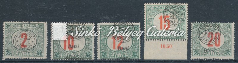 Leírás | 1919. Nagyváradi felülnyomás (Román megszállás) 5db Portóbélyegen eltolódott felülnyomat! R! Bodor M. bélyegszakértő hátoldali bevizsgáló jelével. / 1919. Nagyvarad overprint (Romanian occupation) 5 Porto stamps with shifted overprint! R! With the stamp expert, M. Bodor's proof sign on the backside. |