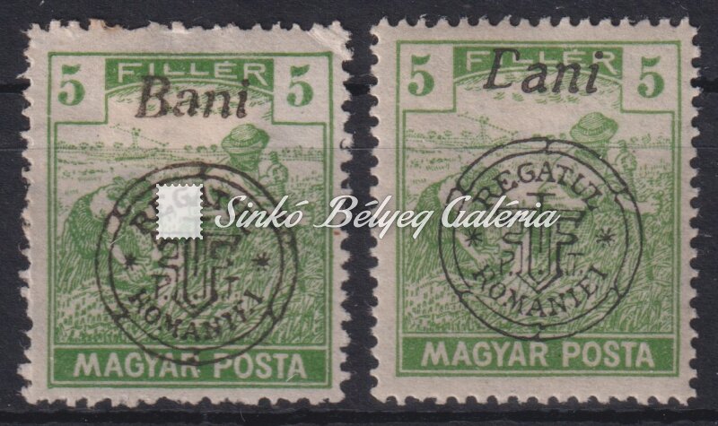 Leírás | 1919. Nagyváradi felülnyomás (Román megszállás) 5f Arató bélyegen hiányos a Bani felülnyomat B betűje! Bodor M. bélyegszakértő hátoldali bevizsgáló jelével. / 1919. Nagyvarad overprint (Romanian occupation) On 5f Harvester stamp, the letter B of the overprint Bani, is incomplete! With the stamp expert, M. Bodor's proof sign on the backside. |