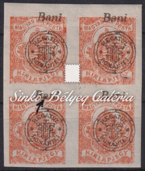 Leírás | 1919. Nagyváradi felülnyomás (Román megszállás) 1913. Hírlapbélyeg 4-es tömbben, VII. vízjellel. A felülnyomat "a" betűje eltömődött! Bodor M. bélyegszakértő hátoldali bevizsgáló jelével. / 1919. Nagyvarad overprint (Romanian occupation) 1913. Newspaper stamp in a block of 4 wit VII. watermark. The letter "a" of the overprint is clogged! With the stamp expert, M. Bodor's proof sign on the backside. |