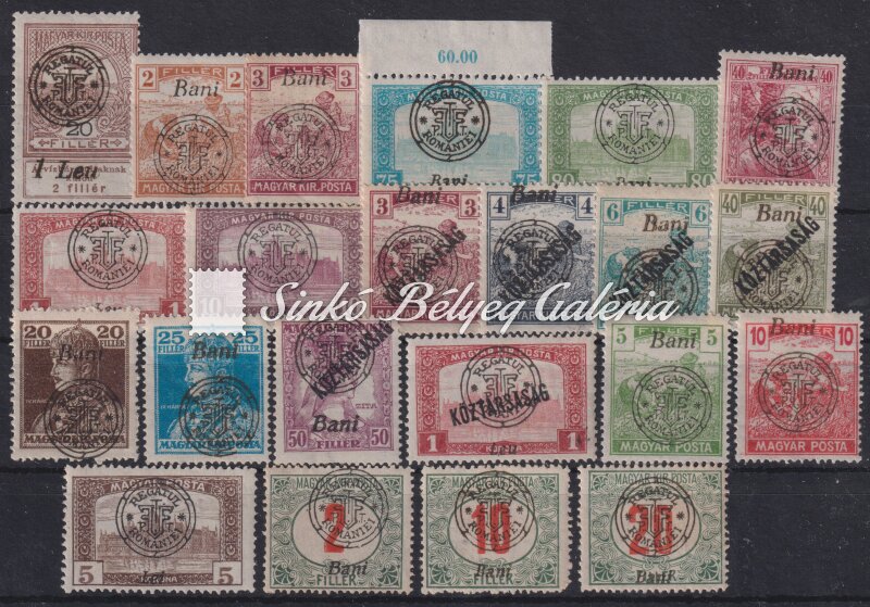 Leírás | 1919. Nagyváradi felülnyomás (Román megszállás) 22db bélyeg. Bodor M. bélyegszakértő hátoldali bevizsgáló jelével. Katalógus érték: 9.700 HUF / 1919. Nagyvarad overprint (Romanian occupation) 22 stamps. With the stamp expert, M. Bodor's proof sign on the backside. Catalogue value: 9.700 HUF |