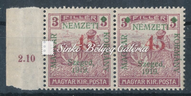 Leírás | 1919. Szeged (Francia megszállás) Ívszéli 45f/3f Arató bélyegpár mindkét bélyege felülnyomat hiányokkal! Bodor M. bélyegszakértő hátoldali bevizsgáló jelével. / 1919. Szeged (French occupation) 45f/3f Harvester stamp pair from the margin of the sheet, both stamps with deficient overprints! With the stamp expert, M. Bodor's proof sign on the backside. |
