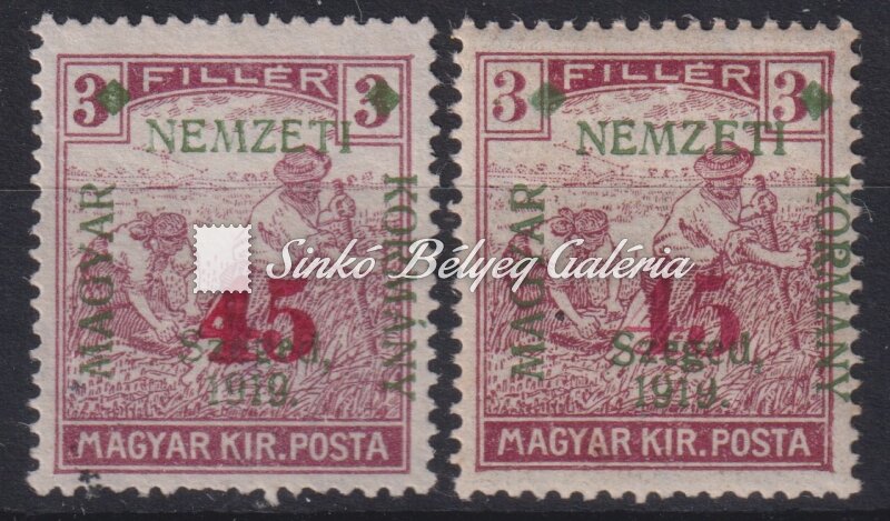 Leírás | 1919. Szeged (Francia megszállás) 45f/3f Arató bélyeg zárt és nyitott 4-es számjeggyel! Bodor M. bélyegszakértő hátoldali bevizsgáló jelével. / 1919. Szeged (French occupation) 45f/3f Harvester stamps with closed and open number 4! With the stamp expert, M. Bodor's proof sign on the backside. |