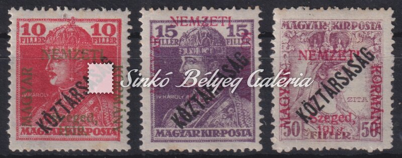 Leírás | 1919. Szeged (Francia megszállás) 3db bélyeg. Bodor M. bélyegszakértő hátoldali bevizsgáló jelével. Katalógus érték: 14.500 HUF / 1919. Szeged (French occupation) 3 stamps. With the stamp expert M. Bodor's proof sign on the backside. Catalogue value: 14.500 HUF |