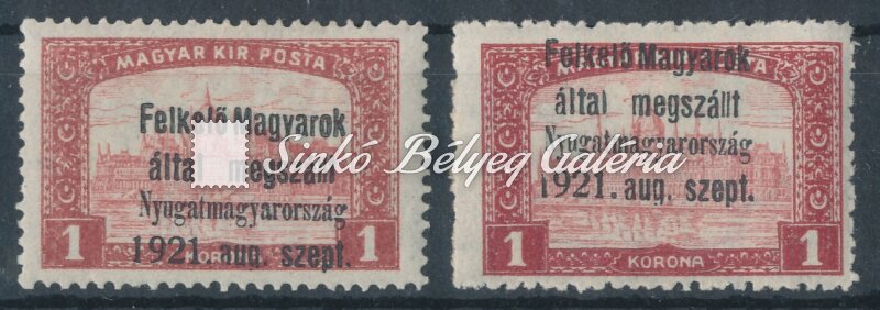Leírás | 1921. Nyugat-Magyarország (I.) 1K Parlament bélyegek jelentős felülnyomat eltolódással. Bodor M. bélyegszakértő hátoldali bevizsgáló jelével. / 1921. Western Hungary (I.) 1K Parliament stamps with significantly shifted overprints. With the stamp expert M. Bodor's proof sign on the backside. |
