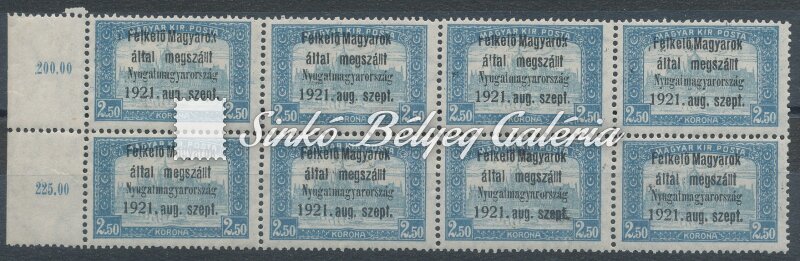 Leírás | 1921. Nyugat-Magyarország (I.) 2,50K Parlament bélyeg 8-as összefüggésben. Bodor M. bélyegszakértő hátoldali bevizsgáló jelével. Katalógus érték: 72.000 HUF / 1921. Western Hungary (I.) 2,50K Parliament stamp in a block of 8. With the stamp expert, M. Bodor's proof sign on the backside. Catalogue value: 72.000 HUF |