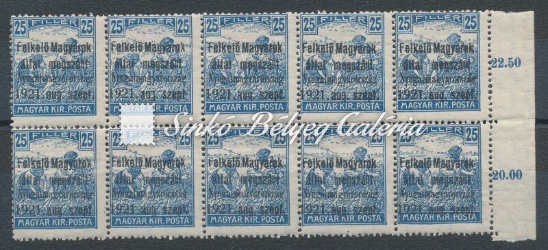 Leírás | 1921. Nyugat-Magyarország (I.) 25f Arató bélyeg 10-es összefüggésben. Bodor M. bélyegszakértő hátoldali bevizsgáló jelével. RRR! Katalógus érték: 150.000 HUF / 1921. Western Hungary (I.) 25f Harvester stamp in a block of 10. With the stamp expert, M. Bodor's proof sign on the backside. RRR! Catalogue value: 150.000 HUF |