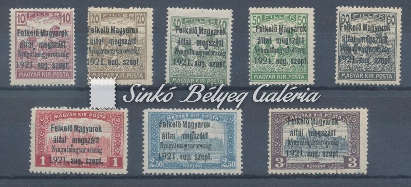 Description | 1921. Nyugat-Magyarország (I.) Teljes sor hármaslyukasztással. Bodor M. bélyegszakértő bevizsgálásával. Katalógus érték: 112.300 HUF / 1921. Western Hungary (I.) Compete set with triple hole punching. With the stamp expert, M. Bodor's proof sign on the backside. Catalogue value: 112.300 HUF |