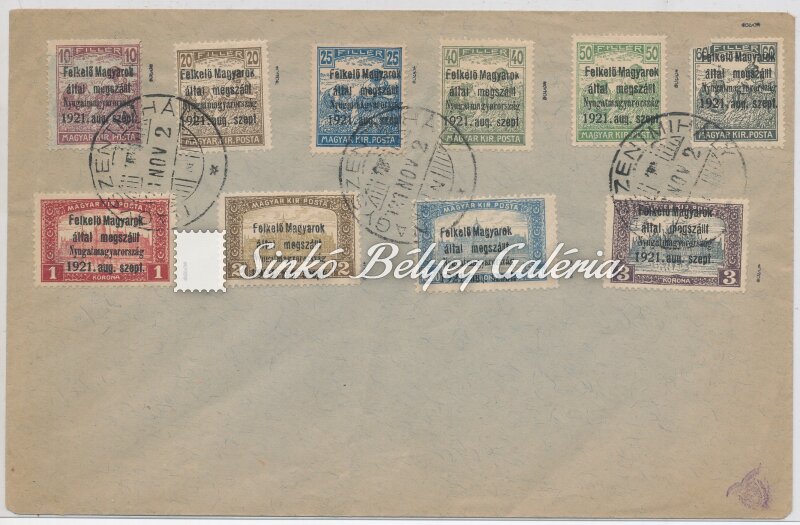 Leírás | 1921. Nyugat-Magyarország (I.) Teljes sor felragasztva levélborítékra és lebélyegezve korabeli NAGYSZENTMIHÁLY bélyegzővel! Bodor M. bélyegszakértő hátoldali bevizsgáló jelével. / 1921. Western Hungary (I.) Complete set sticked on a letter envelope and stamped with contemporary NAGYSZENTMIHALY cancellation! With the stamp expert, M. Bodor's proof sign on the backside. |