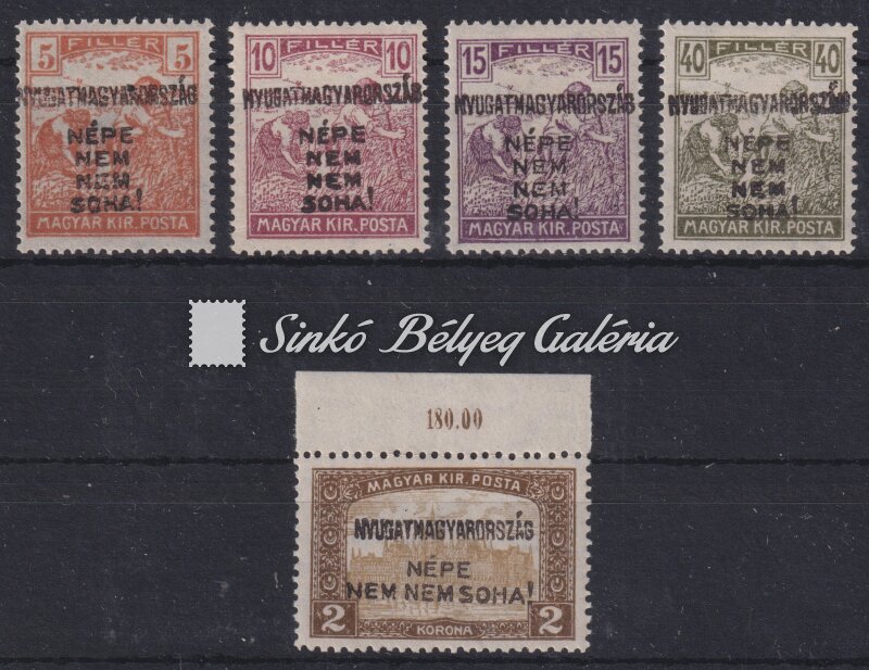 Description | 1921. Nyugat-Magyarország (IV.) 5db bélyeg. Bodor M. bélyegszakértő hátoldali bevizsgáló jelével. / 1921. Western Hungary (IV.) 5 stamps. With the stamp expert M. Bodor's proof sign on the backside. |